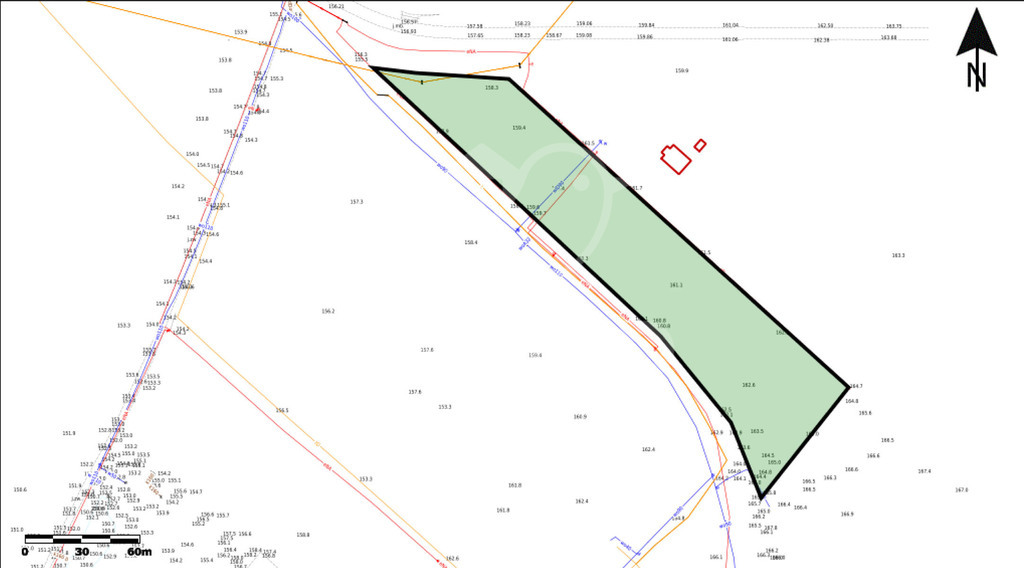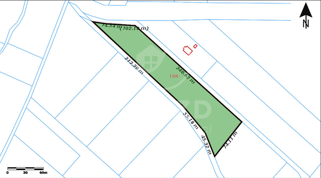 • działka w przybliżeniu prostokątna o wymiarach mniej więcej 74 m x 240 m,